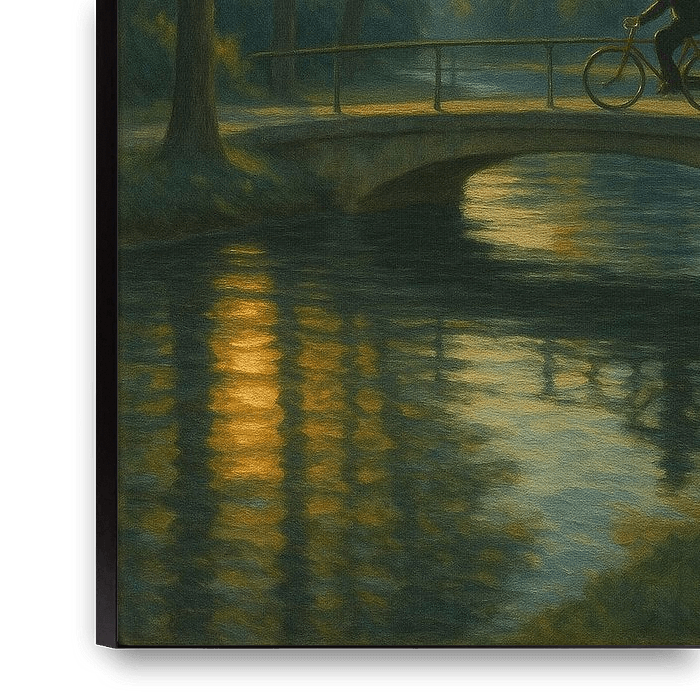 This serene and atmospheric painting captures a quiet moment in Munich's famous Englischer Garten (English Garden). A solitary cyclist, dressed in dark clothing, crosses a small, arched stone bridge over the calm waters of the Eisbach stream. The scene is framed by towering, majestic trees that form a natural cathedral, their leaves…