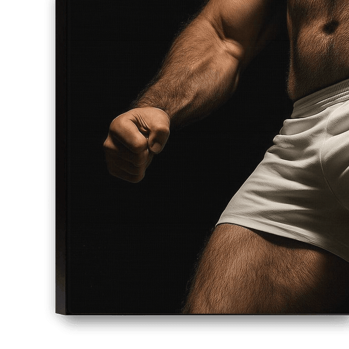 Low-angle shot of muscular man with beard, wearing white shorts against a black background, lit from above.