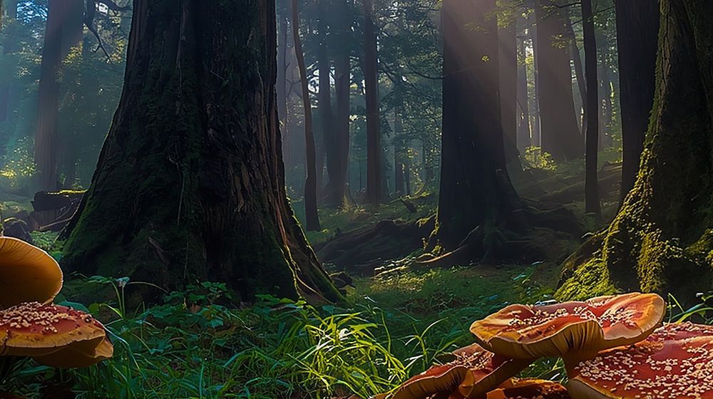 Old forest with sunlight through the trees at the end of the day with some mushrooms and moss in the foreground.