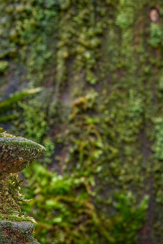 Petrified mushrooms, overgrown with green, on a trunk of a dead tree. Green fungi, mosses have also nestled on the rotting trunk which is a breeding ground for them.