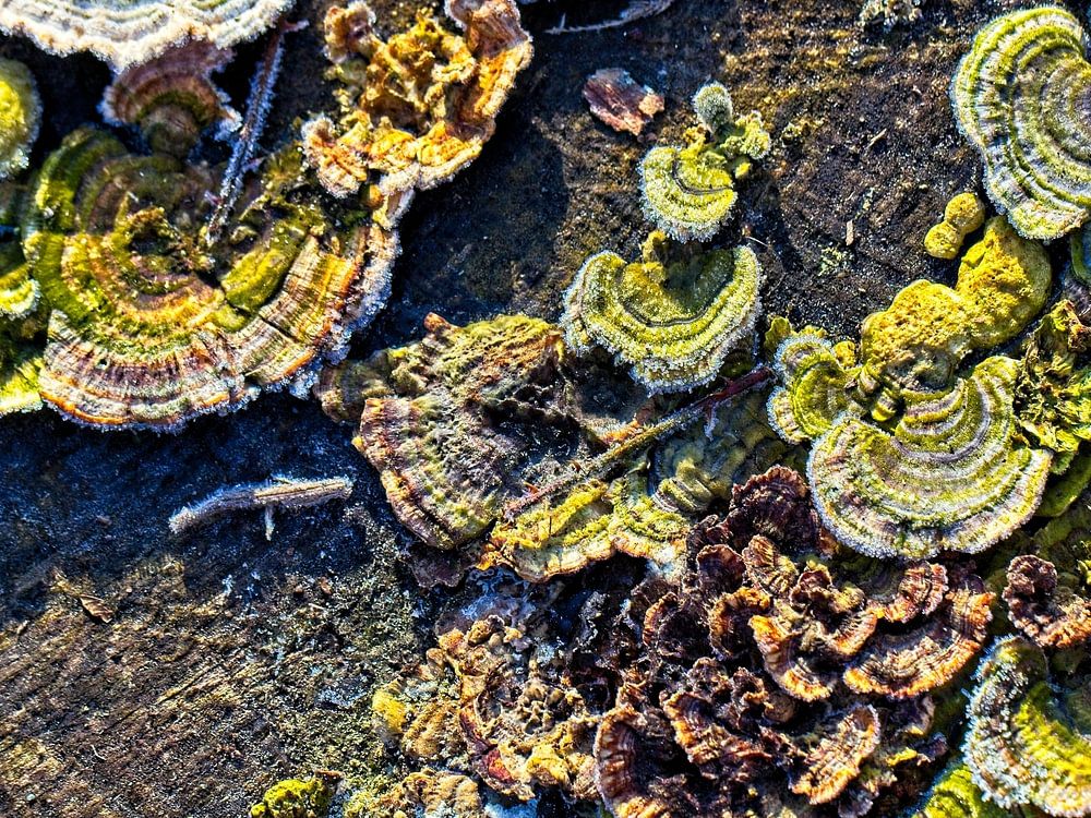Close-up of Mushrooms on dead headwood in first sunlight on a winter day with frost.