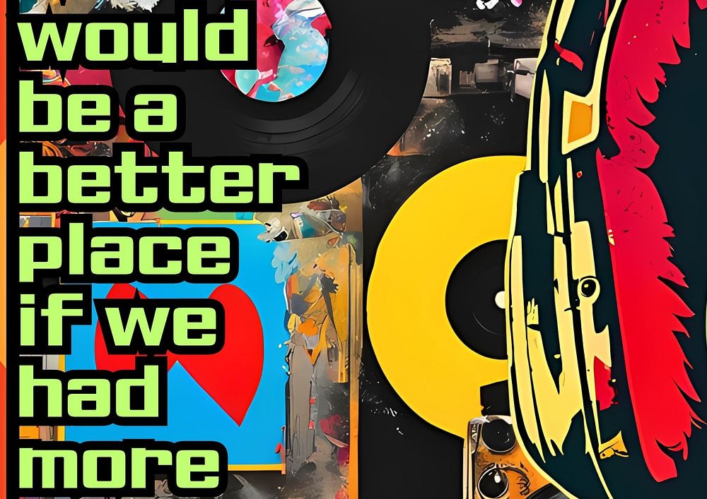 A vibrant, colorful digital art piece features a woman with bright green eyes and red lips, wearing headphones. She is surrounded by a collage of vinyl records, cassette tapes, and other music-related imagery. The background is a mix of black, white, red, yellow, and blue, creating a dynamic and energetic feel.