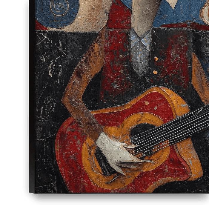 Musicians Cubism Colourful painting captures the energy of live music in a powerful, artistic composition that combines form, rhythm and expression. In this striking work of art, you see a guitarist next to a rock star, both depicted in a surrealistic cubist style that translates movement and emotion into visual forms in a unique way.…