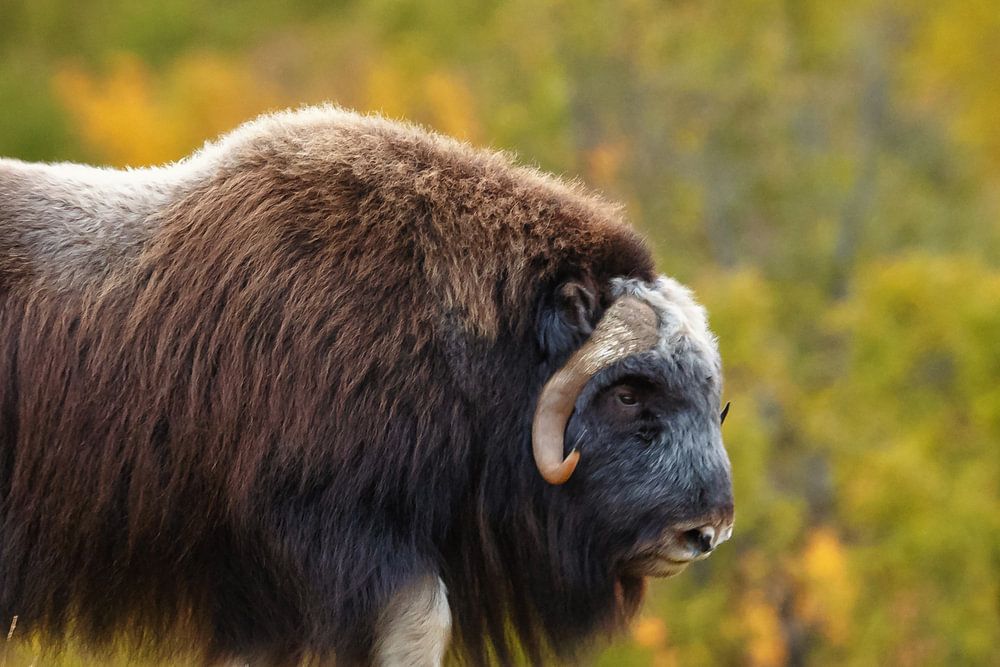 A musk ox in Norway in the Dovrefjell nature reserve. The autumn colours are clearly visible and these primeval-looking animals are preparing for the cold winter ahead.