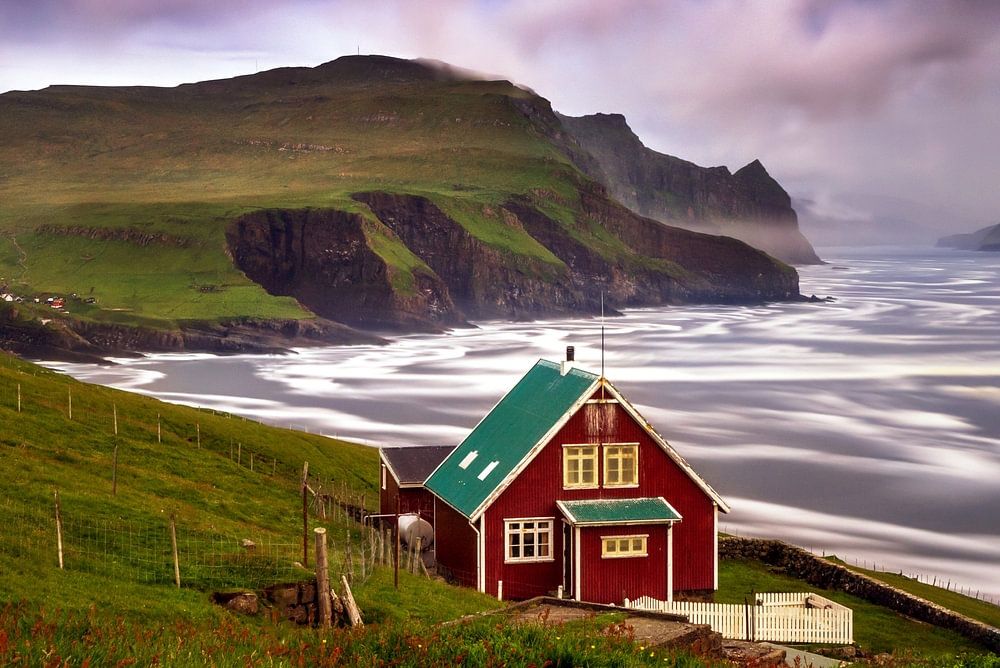 Lonely cabin with sheep on Mykinesholmur island in sunset, Faroe Islands