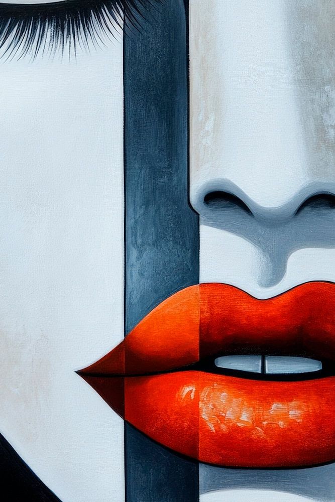 A fascinating interplay of shapes and contrasts unfolds here: The stylised face shape captivates the viewer with intense, red-accented lips and closed eyes. The harmonious combination of black, white and grey tones gives this art a modern, elegant touch. Ideal for the living room, where it stimulates conversation and sets stylish accents.