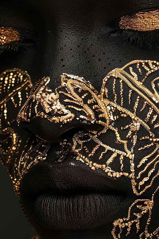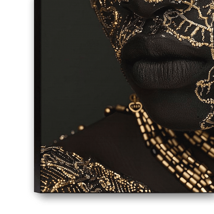 This breathtaking portrait of a woman combines the dark depths of the night with the radiant highlights of gold. The ornate golden ornaments adorning the face and lips create a mesmerising contrast and lend the image an aura of grandeur and mystery. The meticulous details and shimmering gold accents lend the composition an almost divine elegance that transports the viewer into a world of mystical beauty. Ideal for lovers of classical and modern art who want to be inspired by profound and powerful images.