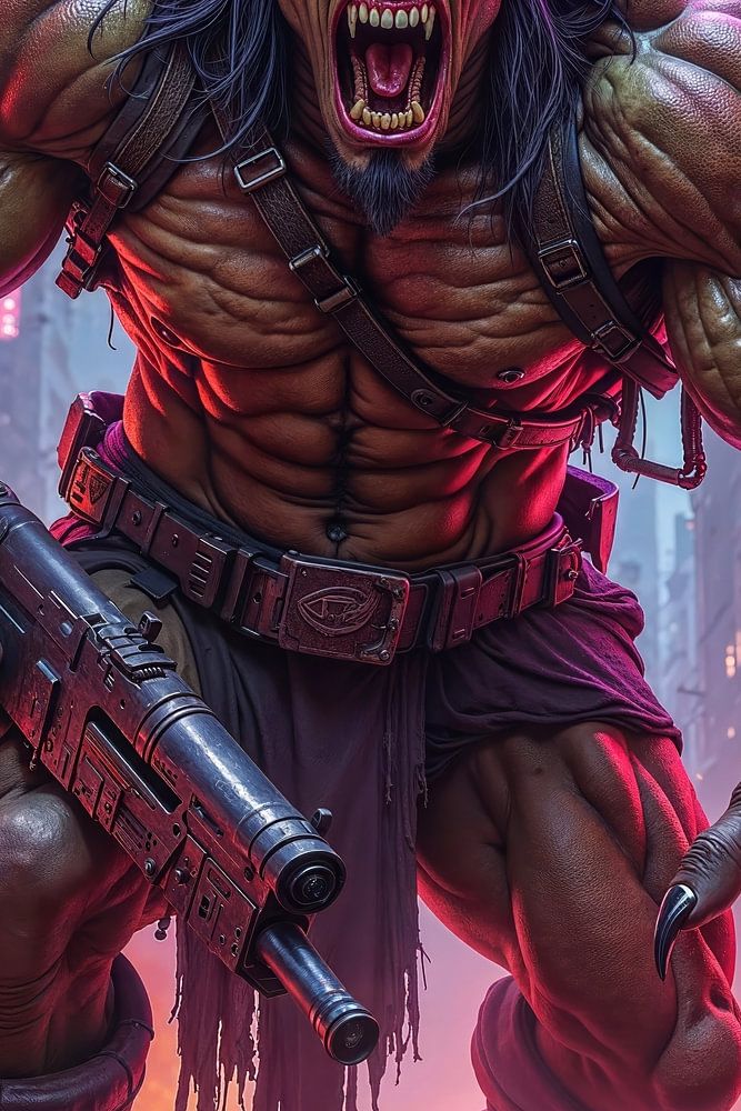 Between collapsed towers, burning rooftops and neon-lit canyons, a towering goblin moves through the rubble of a fallen future city. His green, armor-like skin gleams under flickering light, while steam rises from torn concrete. In his claws, he grips a heavy weapon forged from corroded steel and circuitry. Smoke, heat, debris and the final spasms of a dying metropolis surround him like a burning altar.