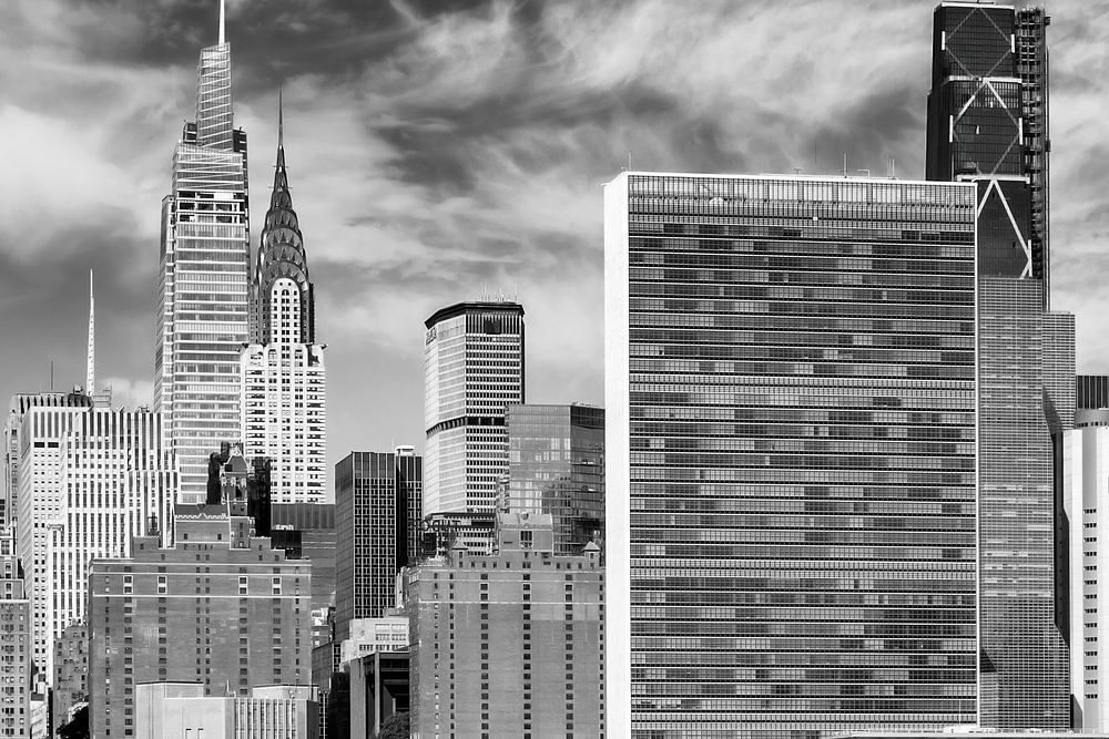 The view of the United Nations building, the Chrysler Building and the impressive One Vanderbilt is a breathtaking panorama that perfectly captures the elegance and importance of New York City as a global center. The UN Headquarters, standing proudly on the banks of the East River, symbolizes peace and international cooperation. Right next to it is the legendary Chrysler Building with its striking Art Deco spire. It symbolizes the glamour and ambition of the city in the golden 1920s and remains a timeless landmark of elegance and style. Next to these two icons, the ultra-modern One Vanderbilt blends majestically into the skyline. The skyscraper, which is the newest addition to the skyline, embodies the future of the city with its striking silhouette and height. Its glass tower and bold lines perfectly complement the historic Chrysler Building, creating an impressive interplay of tradition and future. Stunning black and white impression.