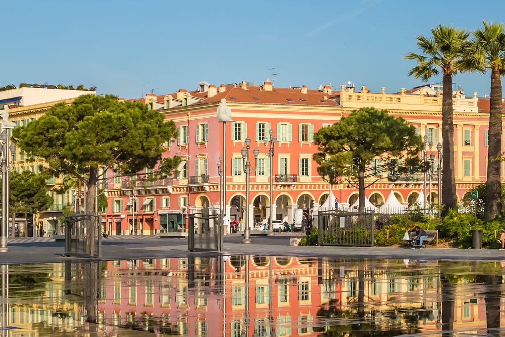 Nice is located at the French Riviera, Côte d?Azur. It is the Mediterranean coastline of the southeast corner of France. It is a heavenly place to be. Promenade du Paillon is a park in the heart of the city. You see a lovely reflection of the skyline in Miroir d'eau. An idyllic cityscape!
