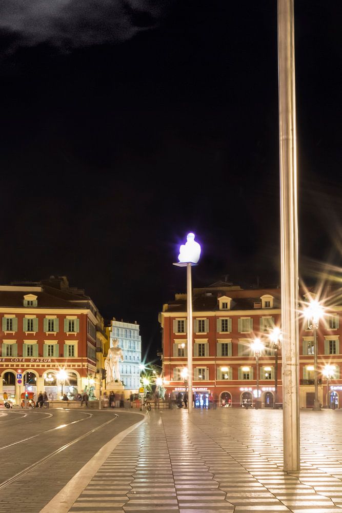 Nice is located at the French Riviera, Côte d?Azur. It is the Mediterranean coastline of the southeast corner of France. It is a heavenly place to be. Place Masséna is the largest square in Vieux Nice. A must-see for all visitors of Nice! It has got the most stunning Neoclassical structures in the city, being bordered by buildings with impressive red facades. In the evening the place is lovely illuminated. The moon is shining.