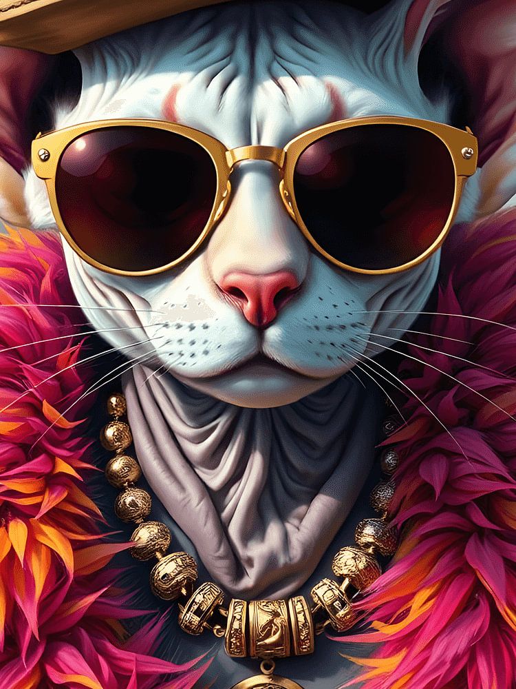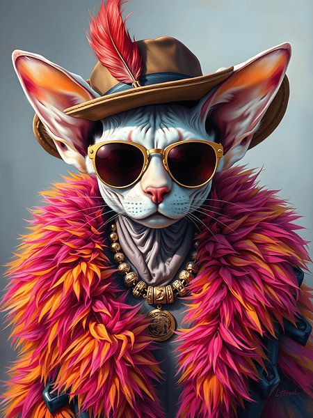 This striking painting shows a pittbull like you rarely see: confident, elegant and with a distinct sense of style. The dog stands proudly upright and is clad in a flamboyant pink feather coat that immediately attracts attention. On his head, he wears a light hat, combined with sunglasses that…