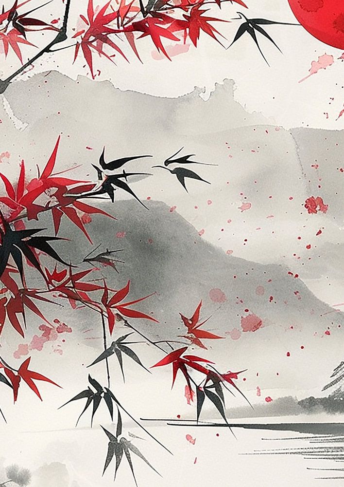 A traditional Japanese watercolour, with nature as the central theme. Black and red ink was used in varying concentrations to capture the essence and spirit of the subject. It depicts a serene landscape with elements such as bamboo and a tranquil river. The painting focuses on simplicity and minimalism, using carefully controlled brushstrokes to convey the delicate beauty of nature. The empty spaces play a crucial role in the composition, creating a sense of balance and calm.