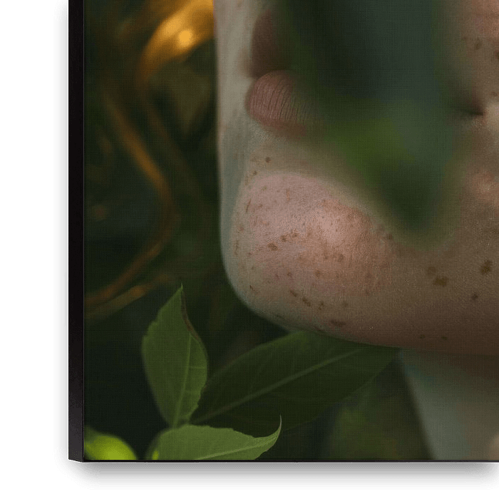 This enchanting portrait of a woman shows her partially hidden behind green foliage with a soft play of light on her face. The freckles give her skin a unique texture and depth, while her eyes shine through the leaves. Ideal for lovers of natural and authentic photography who appreciate the beauty and peace of nature in their artwork.