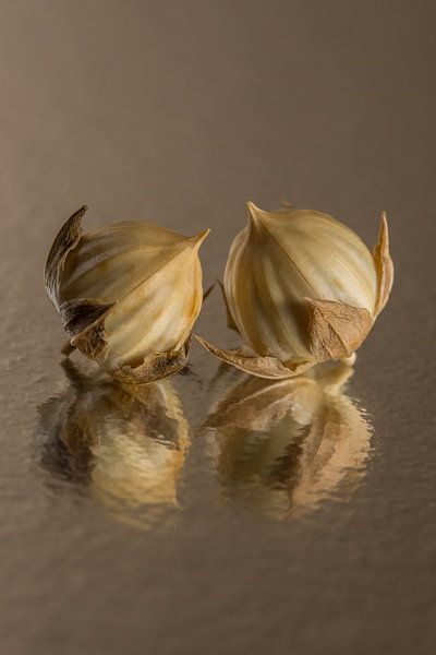 As these simple seed pods lie on a textured reflective surface, an abstract reflection of the two is created in the ground surface. This creates a beautiful effect. The background (and also ground) Is brown in colour, so the whole picture consists of shades of brown.