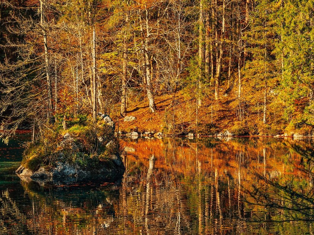 A small lake with deep, clear water bathed in the light of the sunset.