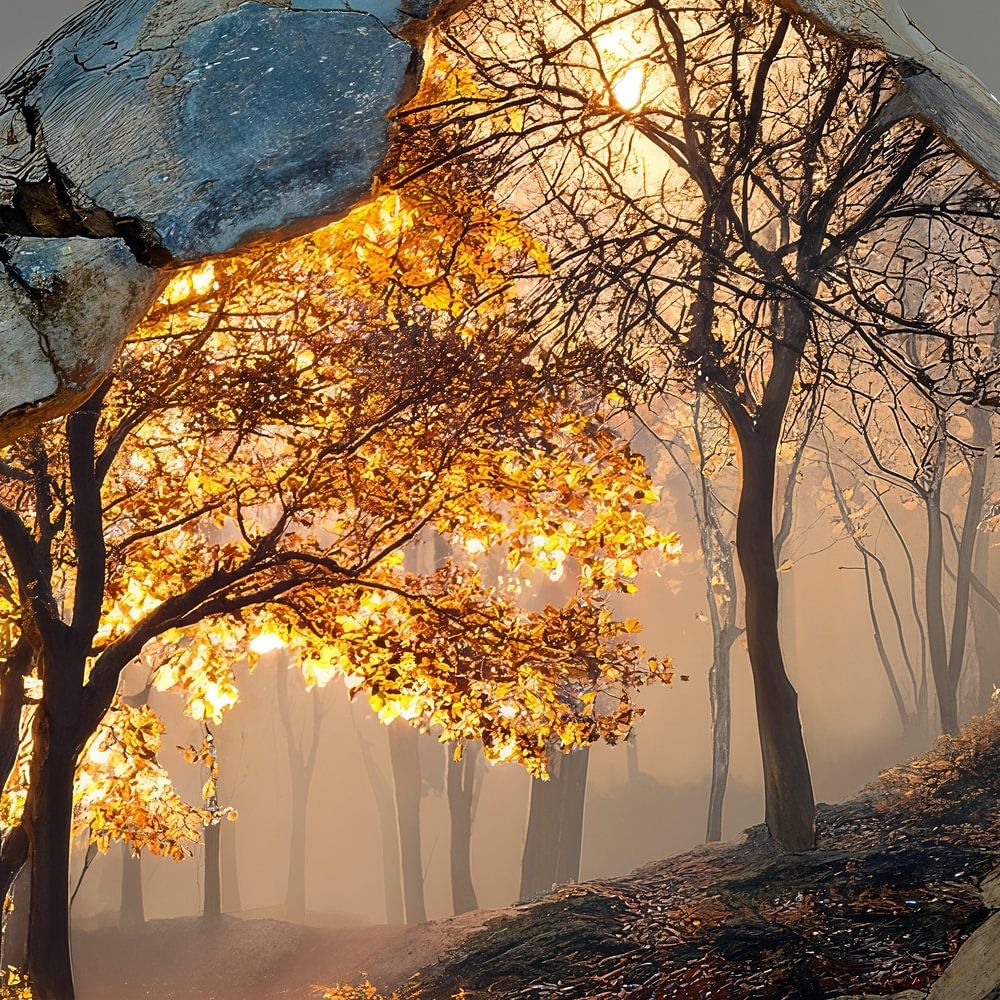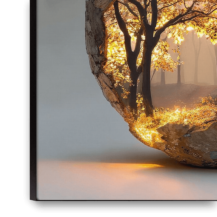 This painting tells a story of fragility and strength. Behind the weathered, cracked surface of a stone jar lies a hidden world: a majestic tree bathed in warm sunlight firmly anchoring its roots, symbolising life, growth and resilience.
