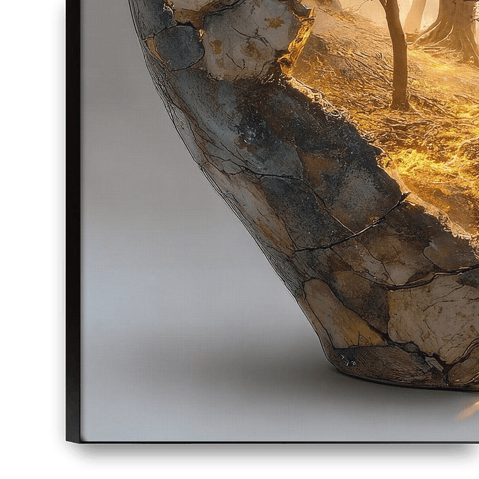 This painting tells a story of fragility and strength. Behind the weathered, cracked surface of a stone jar lies a hidden world: a majestic tree bathed in warm sunlight firmly anchoring its roots, symbolising life, growth and resilience.