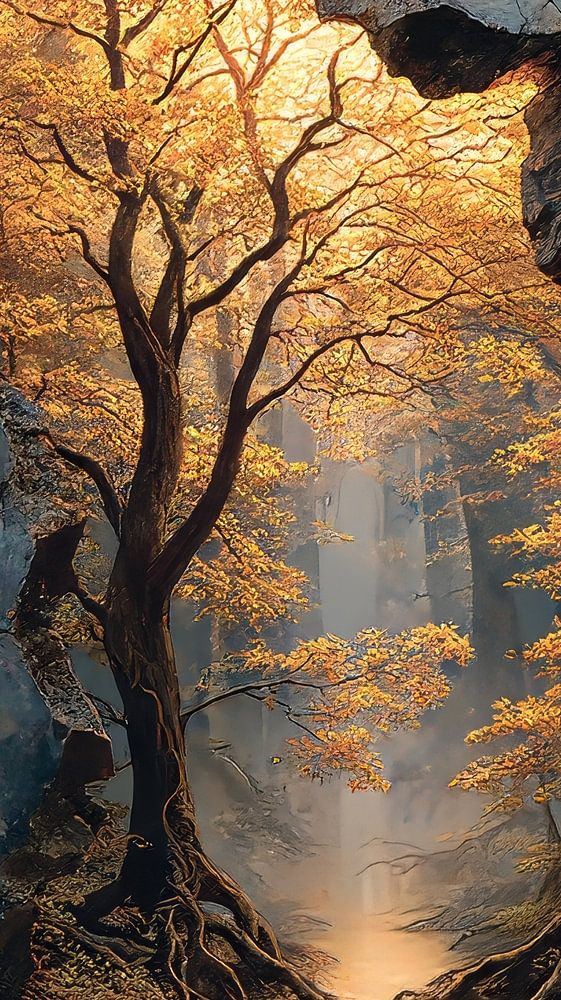 This painting tells a story of fragility and strength. Behind the weathered, cracked surface of a stone jar lies a hidden world: a majestic tree bathed in warm sunlight firmly anchoring its roots, symbolising life, growth and resilience.