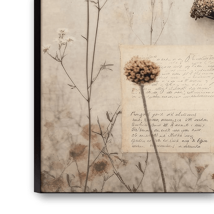 This piece exudes a nostalgic and peaceful atmosphere, with dried flowers subtly presented against a soft, neutral background. The weathered paper with handwritten text adds a sense of timelessness and memory, as if looking through a window into the past. A delicate tribute to fleeting beauty and bygone eras.