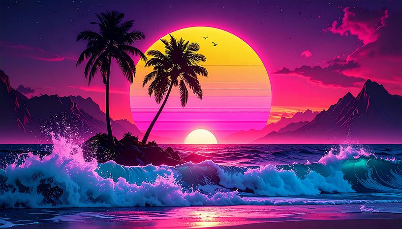 Buy this digital art artwork Neon beach at sunset by Mustafa Kurnaz as a reproduction on canvas, ArtFrame, poster and wallpaper, printed on demand in high quality.