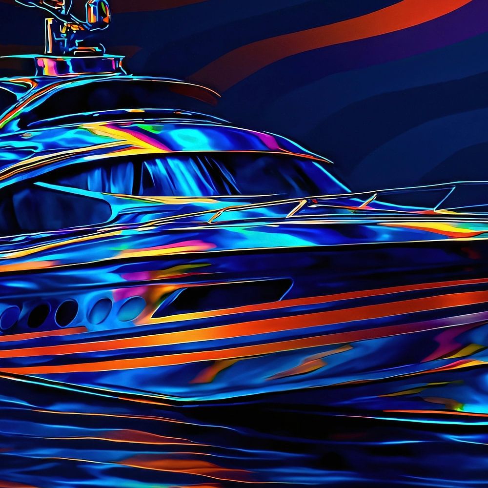 A fascinating digital artwork that combines luxurious yacht design with a futuristic colour palette.
