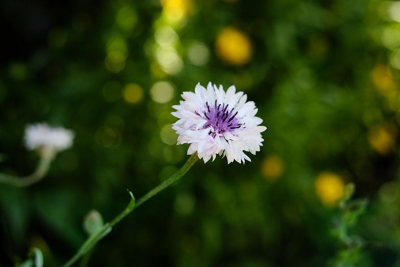Be enchanted by the beauty of nature with this breathtaking close-up photo of a tiny purple Cornflower. This photo was taken in a beautiful Dutch garden and is a perfect representation of the beauty of nature in summer. The little flower takes centre stage in the photo and the soft purple colour of the petals stands out against the bright background of green and yellow. The details of the Cornflower are beautifully captured, from the delicate petals to the pistil and stamens. The photo exudes a sense of calm and serenity, making it perfect for any room or office space. The colours of the flower combine beautifully with the green background and create a harmonious atmosphere. A great way to bring a piece of nature into your home and add a touch of colour to your interior, this picture is a great gift for any nature lover, gardener or anyone who loves the beauty of spring. It is also a great addition to a photo collection or as a decoration in a flower shop, garden centre or other green environment. Whether you have a passion for photography or just love nature, this photo is sure to inspire you and put a smile on your face. Bring the beauty of nature into your home with this beautiful photo of a small purple spring flower.