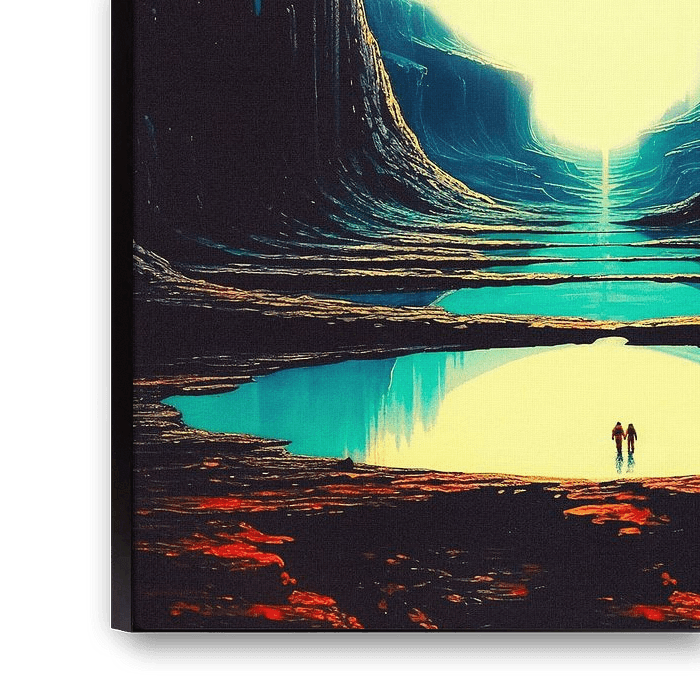 "Never Lost With You" captures a breathtaking cosmic landscape where two tiny figures stand at the edge of a serene, reflective body of water. Towering cliffs surround them, leading the eye towards a glowing, otherworldly sphere on the horizon. The scene is illuminated by a soft, ethereal light that contrasts with the deep shadows of the cliffs, creating a sense of awe and wonder.