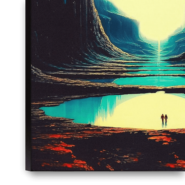 "Never Lost With You" captures a breathtaking cosmic landscape where two tiny figures stand at the edge of a serene, reflective body of water. Towering cliffs surround them, leading the eye towards a glowing, otherworldly sphere on the horizon. The scene is illuminated by a soft, ethereal light that contrasts with the deep shadows of…