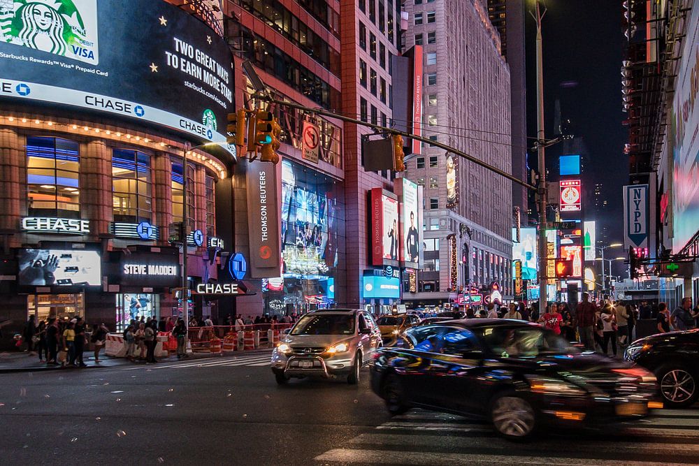 Times Square is both a square and a neighborhood in Manhattan, New York near 42nd Street and Broadway.