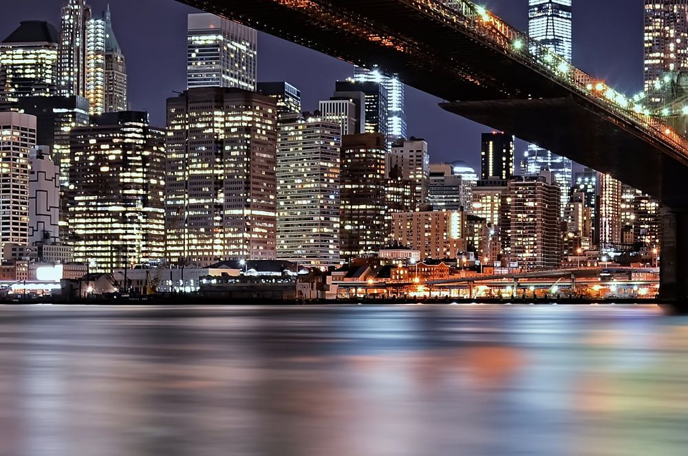Against the illuminated backdrop of Manhattan, New York's most famous bridge shines with its illuminated suspension cables. The many lights of the skyscrapers are reflected in rainbow colors in the East River. A beautiful sight that seems almost surreal.