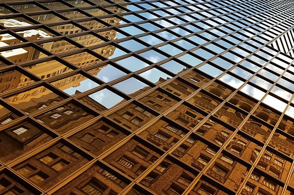 The mirrored facade of a newer skyscraper reflects the older brown buildings. It is precisely this mix in the architecture of Manhattan that makes New York so interesting for the viewer.