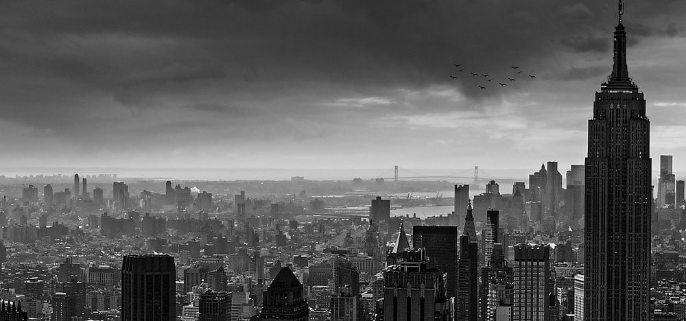 Black-and-white shot of the New York City skyline. The photo was taken from Rockefeller centre in a southerly direction. The Empire State Building can be seen in the foreground on the right, the Statue of Liberty behind on the right and the Brooklyn Bridge on the left.