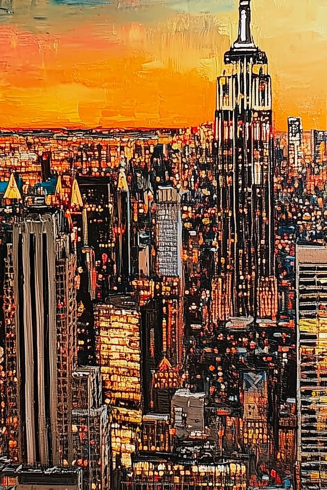 This artwork captures the iconic New York skyline in all its majestic simplicity. With bold brushstrokes and rich colours, the urban horizon is brought to life. The buildings stand out sharply against the sky, with the interplay of light and shadow creating a vibrant dynamism. The use of oil paint adds depth and texture, making the city tangible, with a sense of both movement and timelessness.