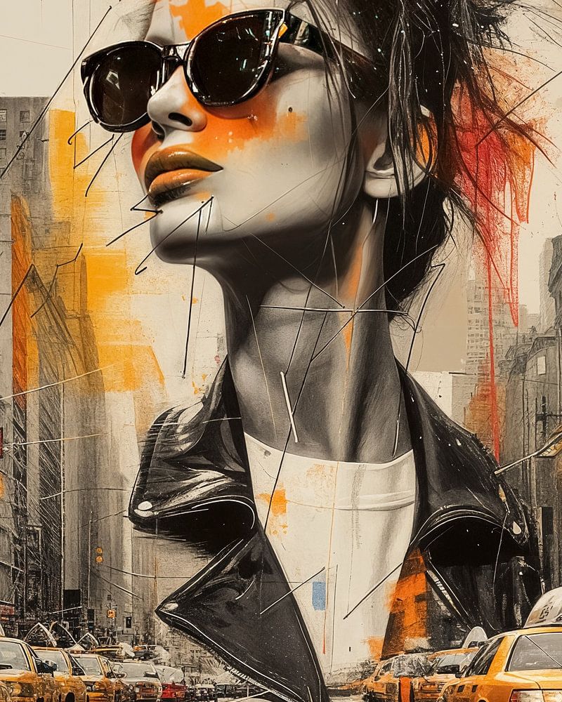 A digital painting called "New York Urban Echo". The art style is a fusion of urban street art and modern pop art, characterised by an energetic mix of photorealistic elements and expressive, abstract splashes of paint. At the centre is a woman with wild, blowing hair and sunglasses, her gaze unfathomable behind the dark glass. The background is a vivid New York cityscape, complete with iconic yellow taxis's and the famous silhouette of the Empire State Building, painted in a palette of urban grey, bright orange and deep red, resulting in a portrait of urban flair and individual coolness.