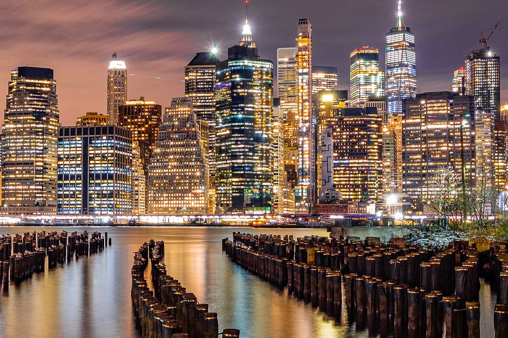 Lung exposure shot from the New York skyline, seen from Brooklyn park. The lights and the colors come out nicely in this HDR picture. New York at night.