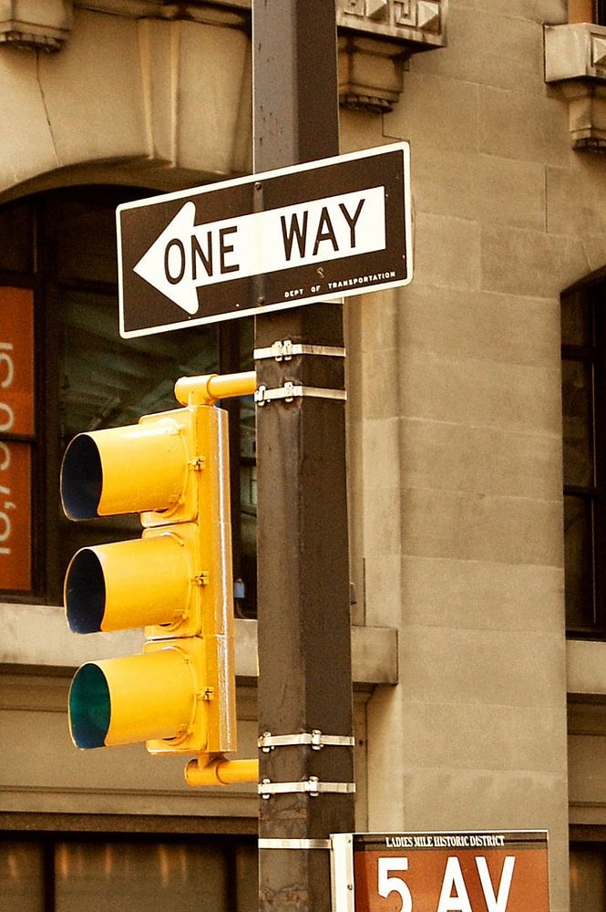 A yellow traffic light on Fifth Avenue, arguably the most famous street in Manhattan with a "One Way" sign and a "5 AV" street sign.