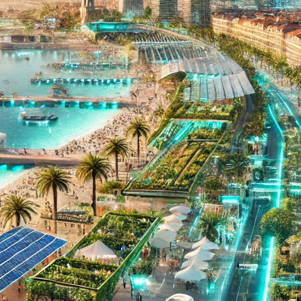 This digital poster shows an impressive vision of the French coastal city of Nice, which combines futuristic technology with idyllic beach charm. Palm-lined boulevards, sparkling blue sea and advanced green technologies merge into a harmonious overall concept. The urban landscape radiates optimism and progress and invites the viewer to dream of a better, environmentally friendly future.