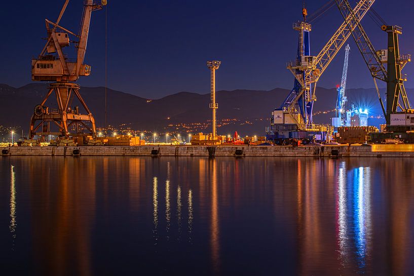 Massive harbour cranes dominate the scenery of the illuminated port of Rijeka at nightfall.