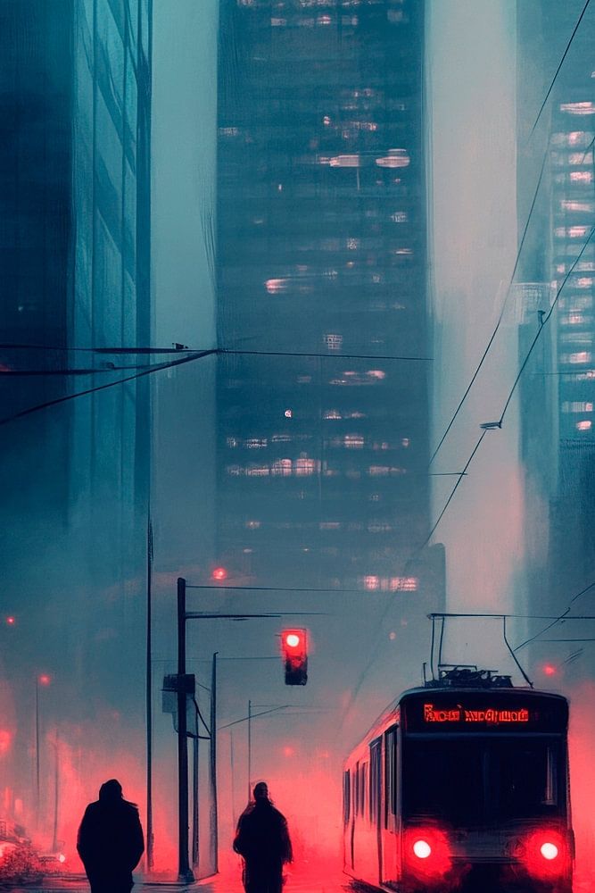 In the middle of a mystical city skyline, the dim light is reflected in the rain-soaked streets. Red accents add a touch of drama to the scene, while silhouettes of passers-by stride through the fog. This captivating composition is perfect for the living room to transport the viewer into an urban dream world.