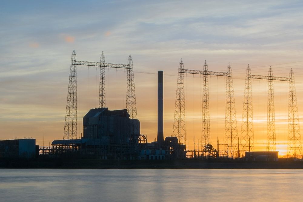 Fantastic sunset at the old power station of Nijmegen. Blue, orange and yellow colours at sunset. Long shutter time over the river De Waal.