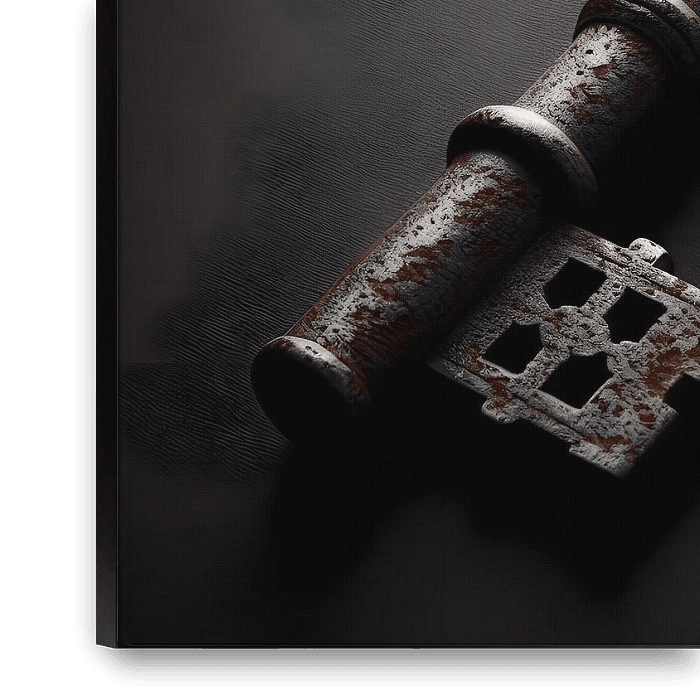 Be transported to days gone by with this old antique key, set against a dark background. The weathered metal structure tells stories of hidden doors and forgotten secrets. Every detail, from the ornate handle to the robust beard, exudes history and character. The dark setting emphasises the timeless elegance and intriguing power of this…