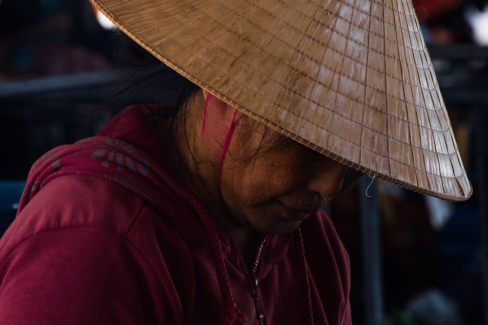 A market vendor woman in Hội An (Vietnam) prepares her produce for sale and wears a trandition nón lá hat (cone hat/tip hat).