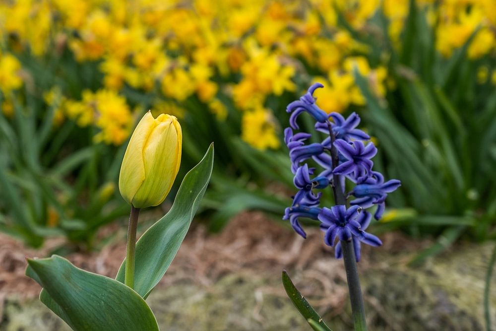 Beautiful Spring Flowers in Noordwijk - A breathtaking composition of spring in the bulb region (0106), where a yellow tulip and a purple hyacinth shine together in the front plan. Behind them stretches a lush field of yellow daffodils, which is the ultimate symbol of the abundant beauty of spring in this picturesque area.