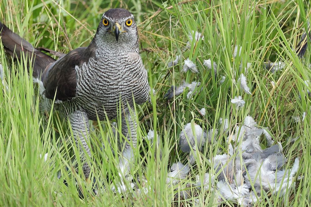 A Northern Hoshawk at the edge of a pond feeding on a pigeon which it has caught. This Northern Goshawk is a powerful hunter, taking birds and mammals in a variety of woodland habitats, often utilizing a combination of speed and obstructing cover to ambush their victims. Northern Goshawks often forage in adjoining habitat types, such as the edge of a forest and meadow.