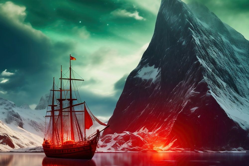 Cold night in Norway, Northern Lights in the background, Big mountains, lights and a sailboat on the sea