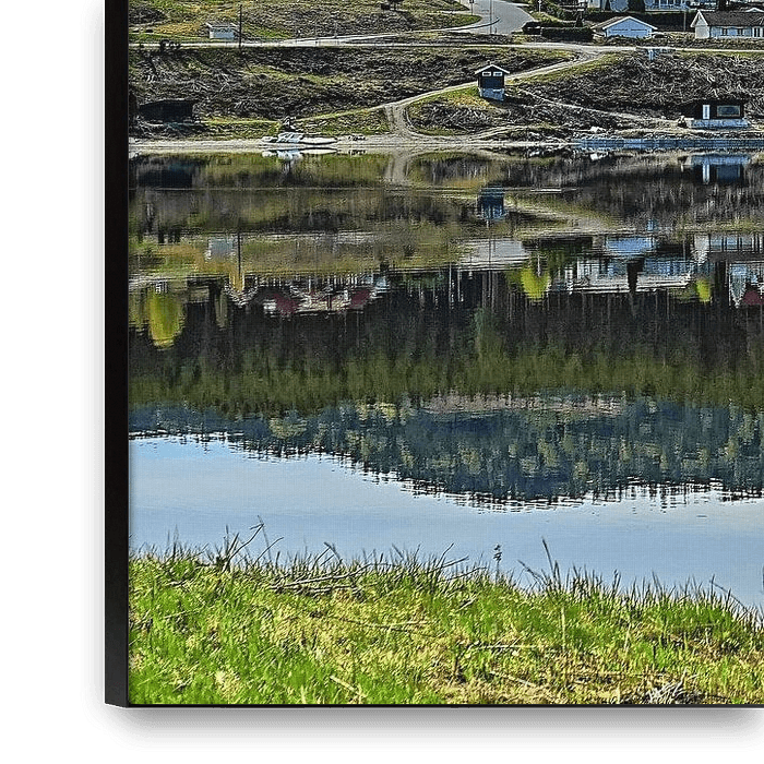 The calm water reflects a small settlement on the wooded hillside, giving the scene a clear, almost meditative symmetry. Fresh greens, soft light and the Nordic landscape create depth, calm and timeless harmony. It is a picture that conveys a sense of space and opens up rooms.