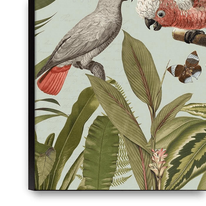 Buy this flower art Nostalgic tropical parrots fight in jungle landscape 1 by Floral Abstractions on canvas, ArtFrame, poster and wallpaper, printed on demand in high quality.