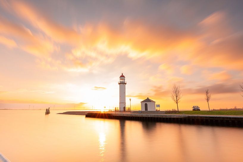 What a fiery sky during this sunset, near the Hellevoetsluis lighthouse! The movement in the clouds contrasts beautifully with the calm water. The lighthouse is the icon of fortified Hellevoetsluis. Not for nothing is this one of my favourite photo locations.