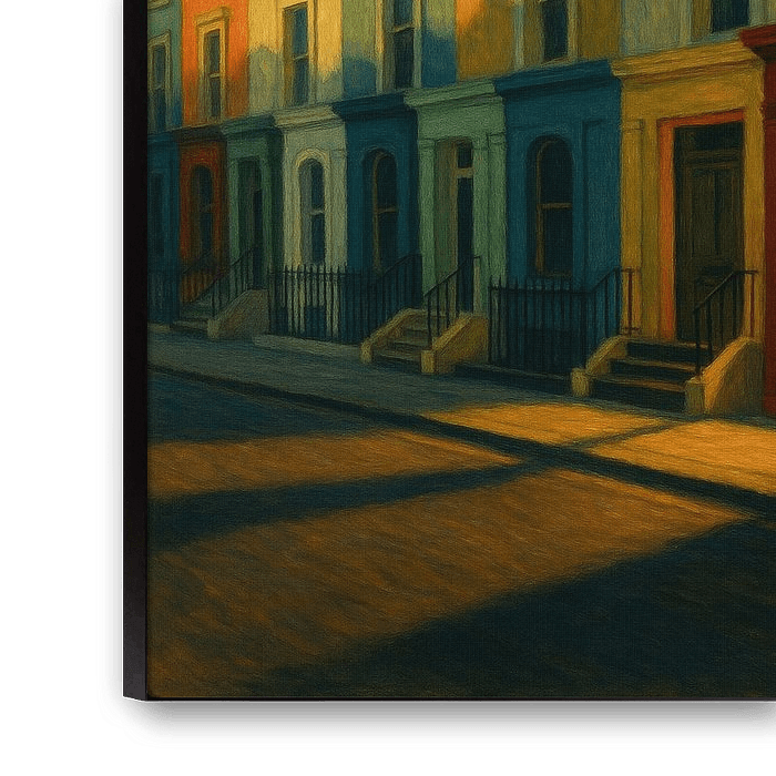 Ideal for contemporary interiors, boutique cafés, or elegant studios, Notting Hill Charm serves as fine-art wall décor that brings personality and calm to any space. Its golden palette enhances neutral walls and modern furnishings, creating a focal point that feels cinematic yet intimate. Whether displayed as a single statement piece or paired within a gallery of European cityscapes, this artwork embodies timeless elegance and urban tranquility. It invites the viewer to pause, reflect, and rediscover the poetry of everyday light.